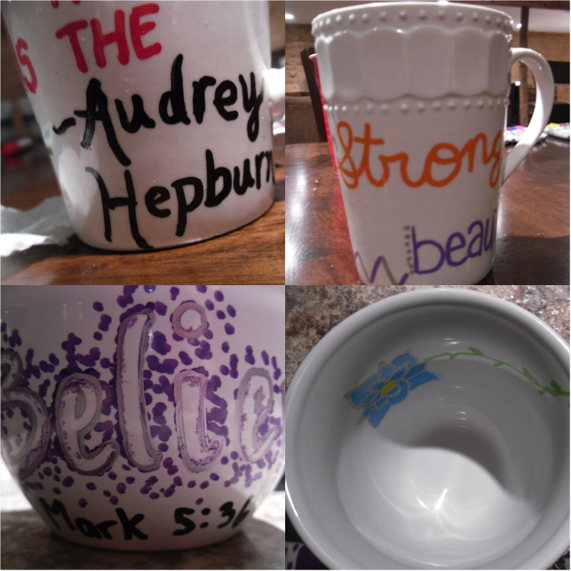 After getting some awesome colors on our nails, we did a cool craft. We got some plain white mugs and decorated them with sharpies, then put them in the oven awhile to cook the marker on. This craft was super easy and fun, and I think everyone will use them.